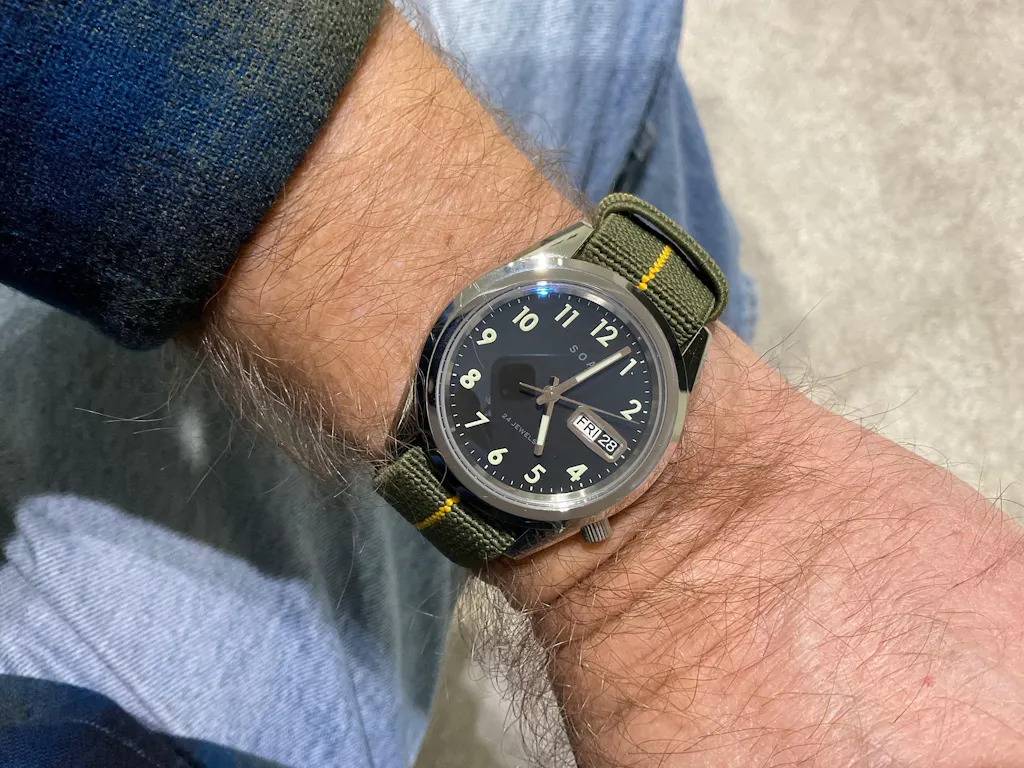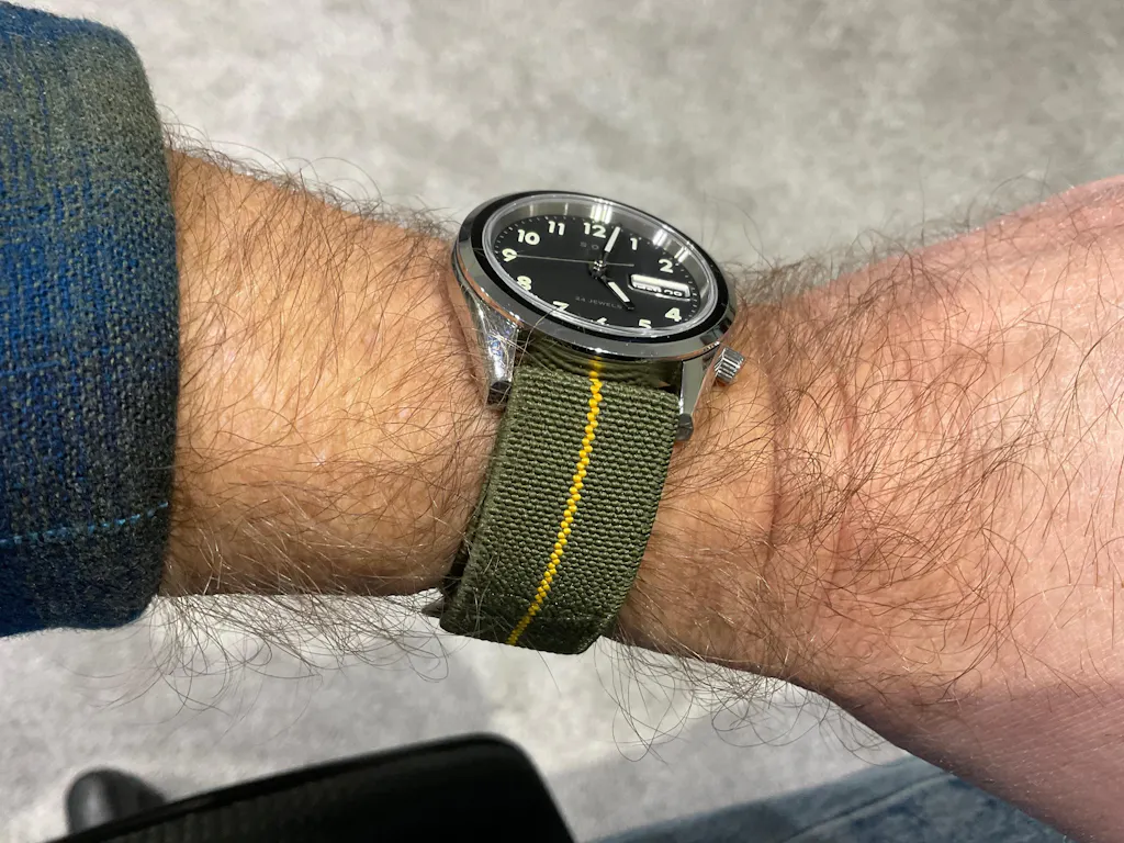 Love this band—the elastic arrives slightly faded, with a vintage vibe, and it’s remarkably easy to size for any number of 20mm lug watches. Just get the elastic through the spring bars, and, boom, you’re ready to go. I like this band for activities—running, anything active—and if you tune the fit correctly, it’s secure without cutting off the circulation. Keep the extra material to run under the clip to prevent digging/chafing. If you’re on the fence, pull the trigger.
